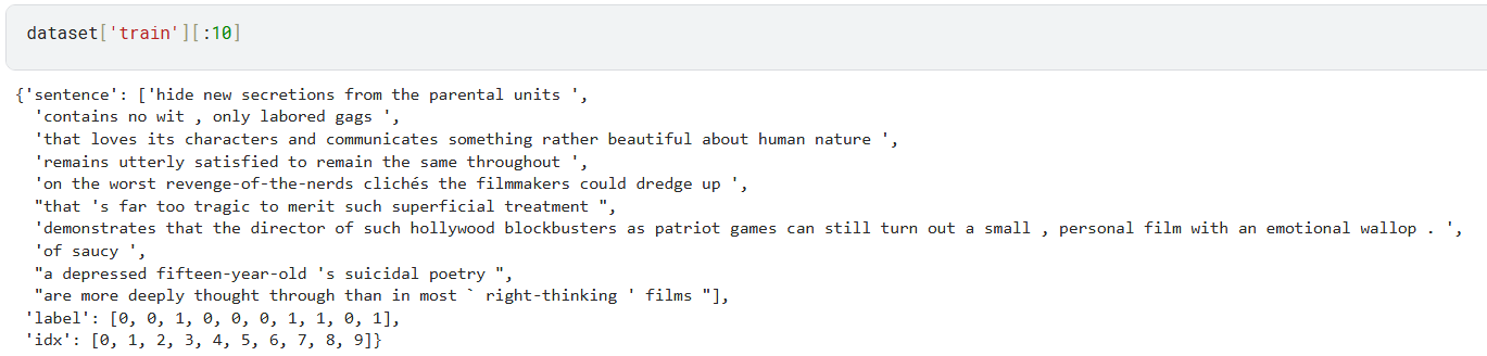 实验任务 微调 Bert 基础模型让其实现情感二分类,使用的数据集为 sst-2,其数据结构如下所示。