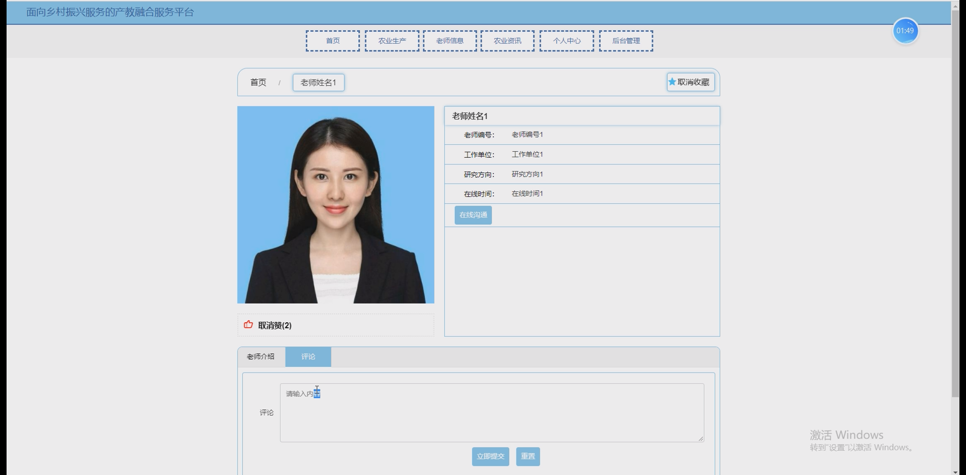 - 设计并实现平台的核心功能模块,满足农民农业生产咨询、学生实践对接、教师教学服务等需求;