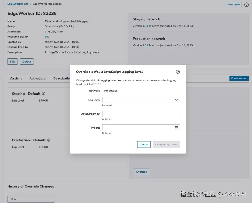 DataStream 集成的一个便捷特性是,无需编辑和重新部署代码即可修改在 EdgeWorkers 代码包中定义的日志级别。使用日志"覆盖",可以根据需要切换函数日志以设置日志级别和详细程度,允许用户仅在需要更细粒度信息之前记录错误。这样做的好处是灵活性,同时控制日志量以避免额外的可观测性成本。请参阅以下示例,了解如何通过 UI 或使用 CLI 控制日志级别。
