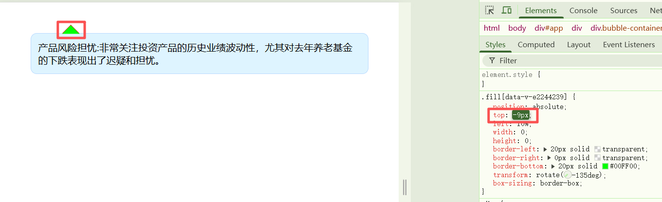 绿色三角形把红色三角形完全遮挡住了,在浏览器里修改绿色三角形的top值,变大变小的效果都可以试试,当绿色三角形比红色三角形下移1px时,出现了一个红色三角边框,距离想要的效果很近了。