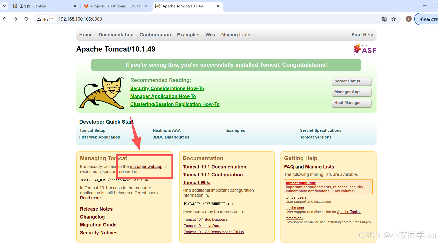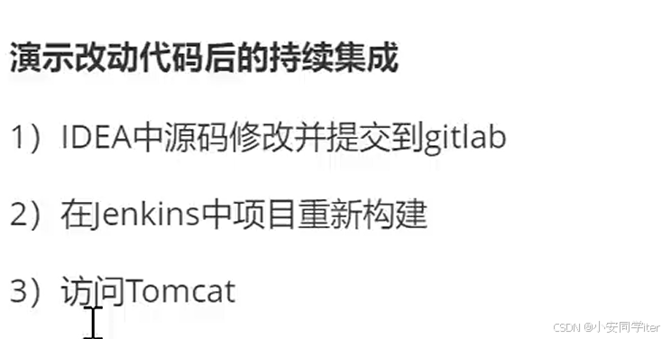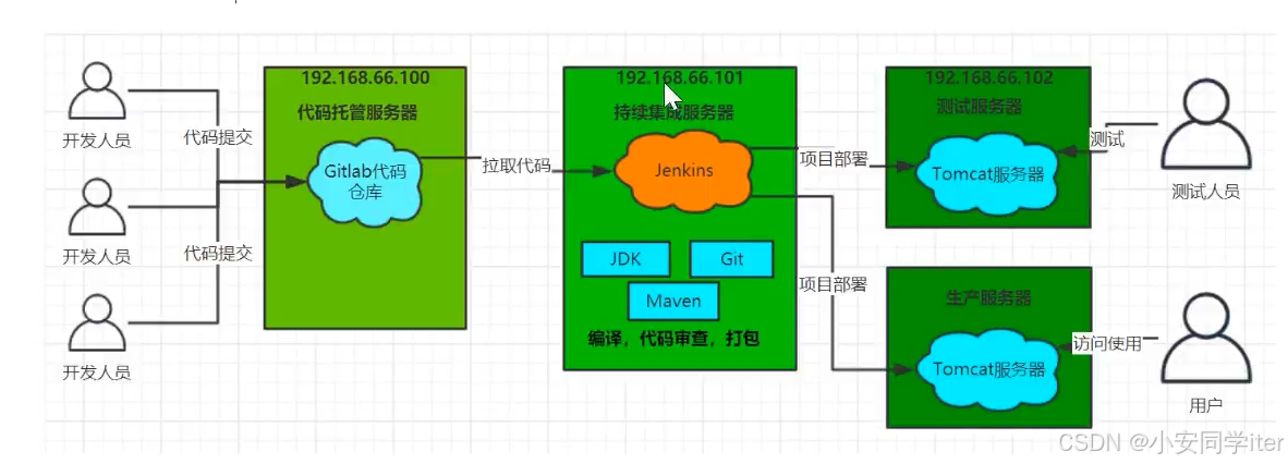 总体概括从gitlab的代码管理,开发者借助这个gitlab代码仓库进行管理,借助idea进行集成,提交与上传,借助jenkins进行持续集成,持续部署,同时配置对应的maven与tomcat,最后借助tomcat服务器进行部署上线从而进行访问。整个流程涉及到许多的权限管控的部分,gitlab需要账号,jenkins需要账号同时还有对应的角色权限,以及tomcat也开启角色权限管控。