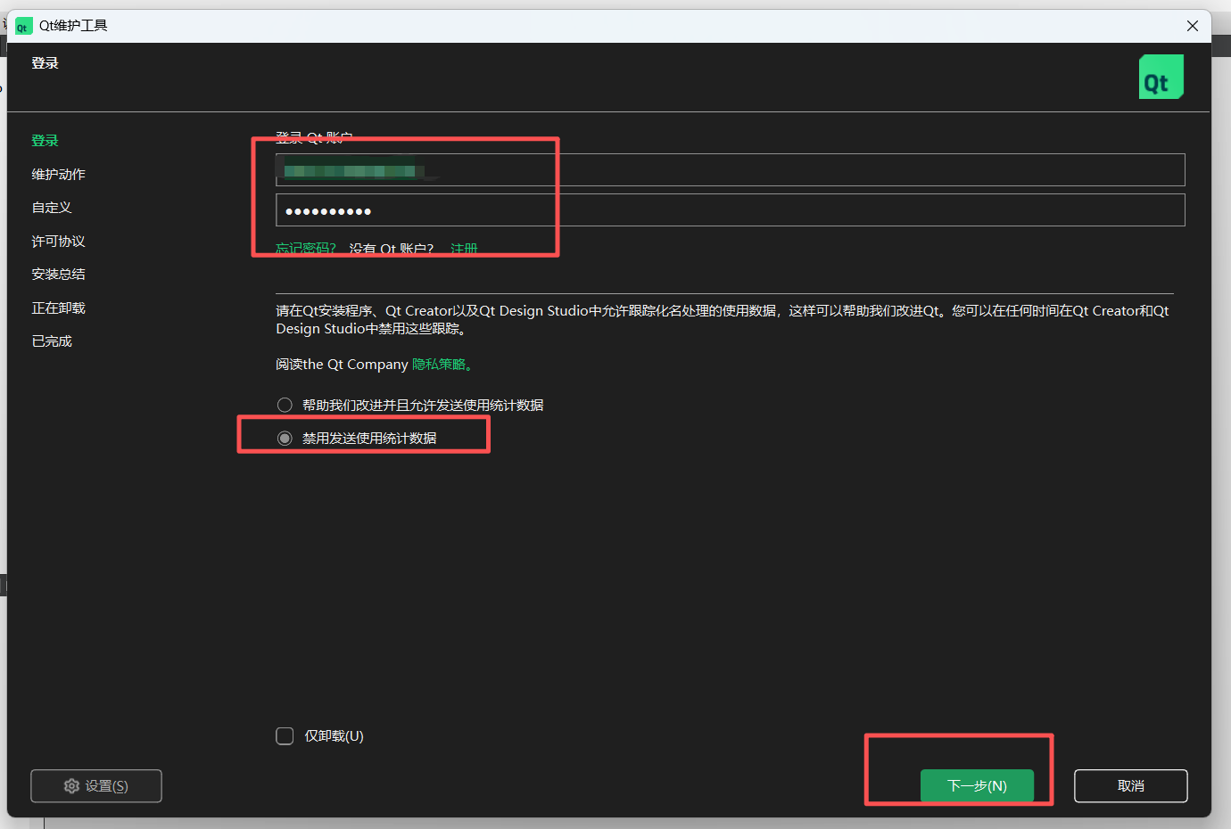 按照下图红色框体所示,用自己之前注册的账号登录。(忘记密码就选择忘记密码即可,Qt会在注册邮箱中发一个修改密码的链接,打开输入新的密码,并可以登录)