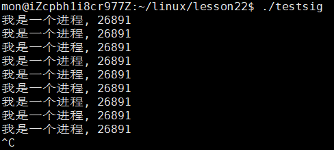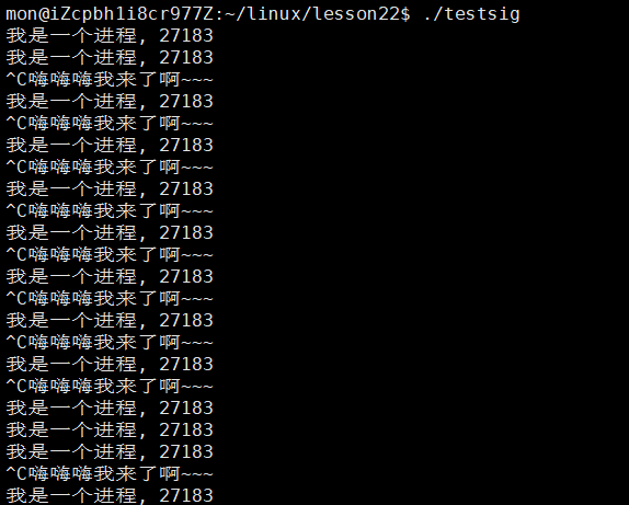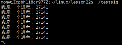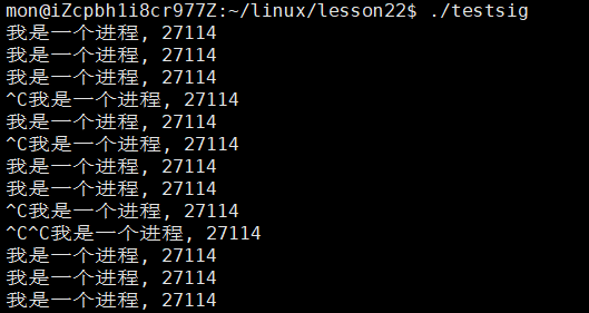 从结果中我们可以看到,在调用了signal函数让当前进程忽略SIGINT信号后,我们再次通过ctrl + c就无法再终止进程了,可见我们确实可以通过signal函数来更改进程对信号的处理方式。