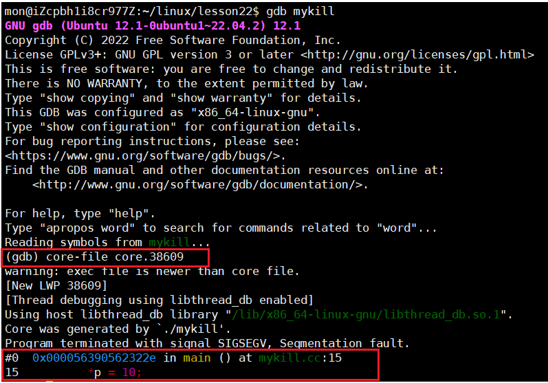 而这个core文件将来就可以用于调试,就可以定位到具体是哪一行代码出的问题了。