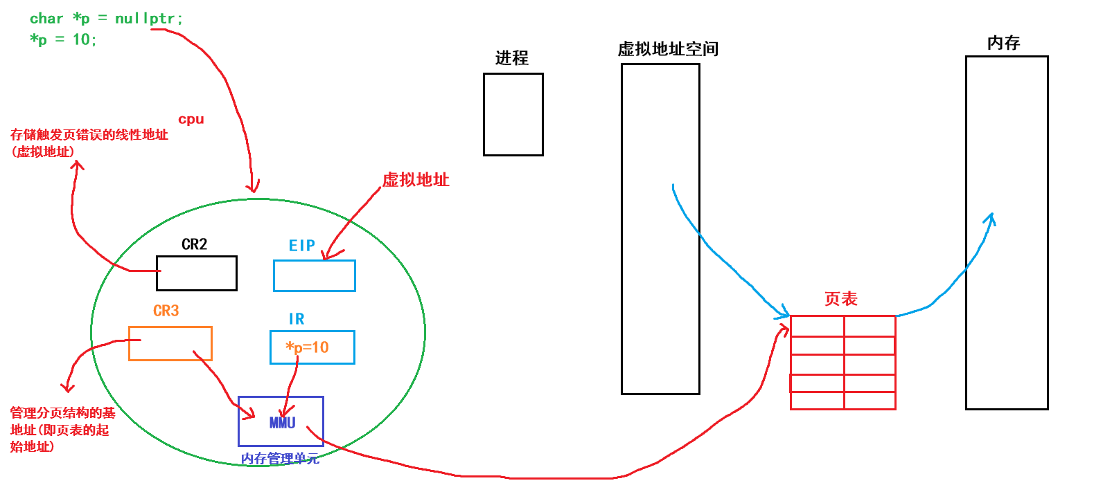 MMU就会立即触发一个硬件异常(页错误),之后它会将野指针的虚拟地址写入到CR2寄存器中,CR2寄存器是用来存储触发页错误的线性地址的,也就是和上面的\0操作一样:本次操作在硬件上报错了!!!