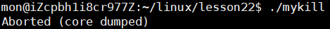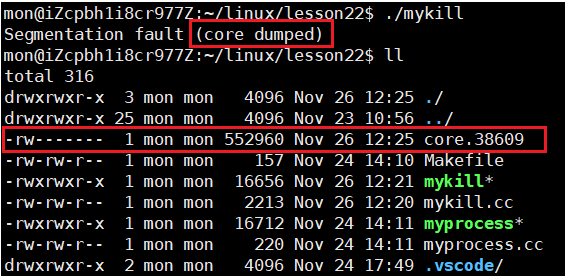 结果如我们所料,在报的错后面就跟上了core dumped的字眼,说明执行了core dump操作,而我们查看当前目录下的文件,可以看到此时就有了一个core文件。