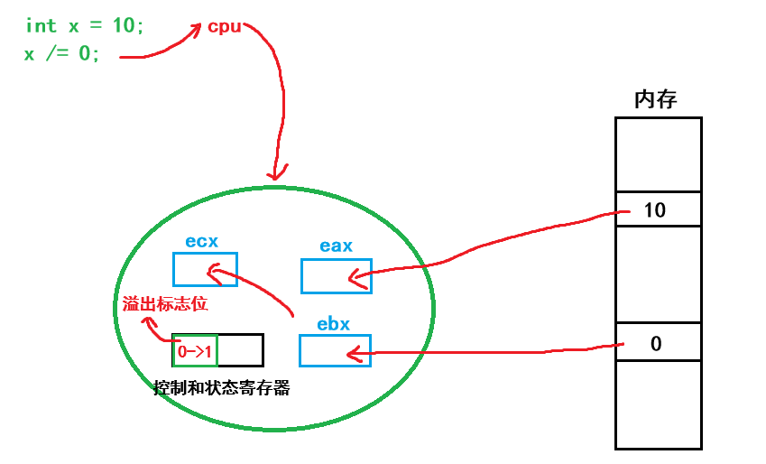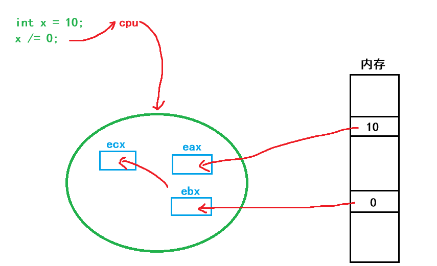 众所周知我们写的代码中的一些数据计算,都是加载到内存中后,在进程被调度时这些数据会被加载到cpu中的某些寄存器中,这里我就以eax,ebx和ecx来举例,就比如上面的10放在eax中,0放在ebx中,而他们计算的结果放在ecx中,而这些寄存器本质就是:当前进程的硬件上下文!!!