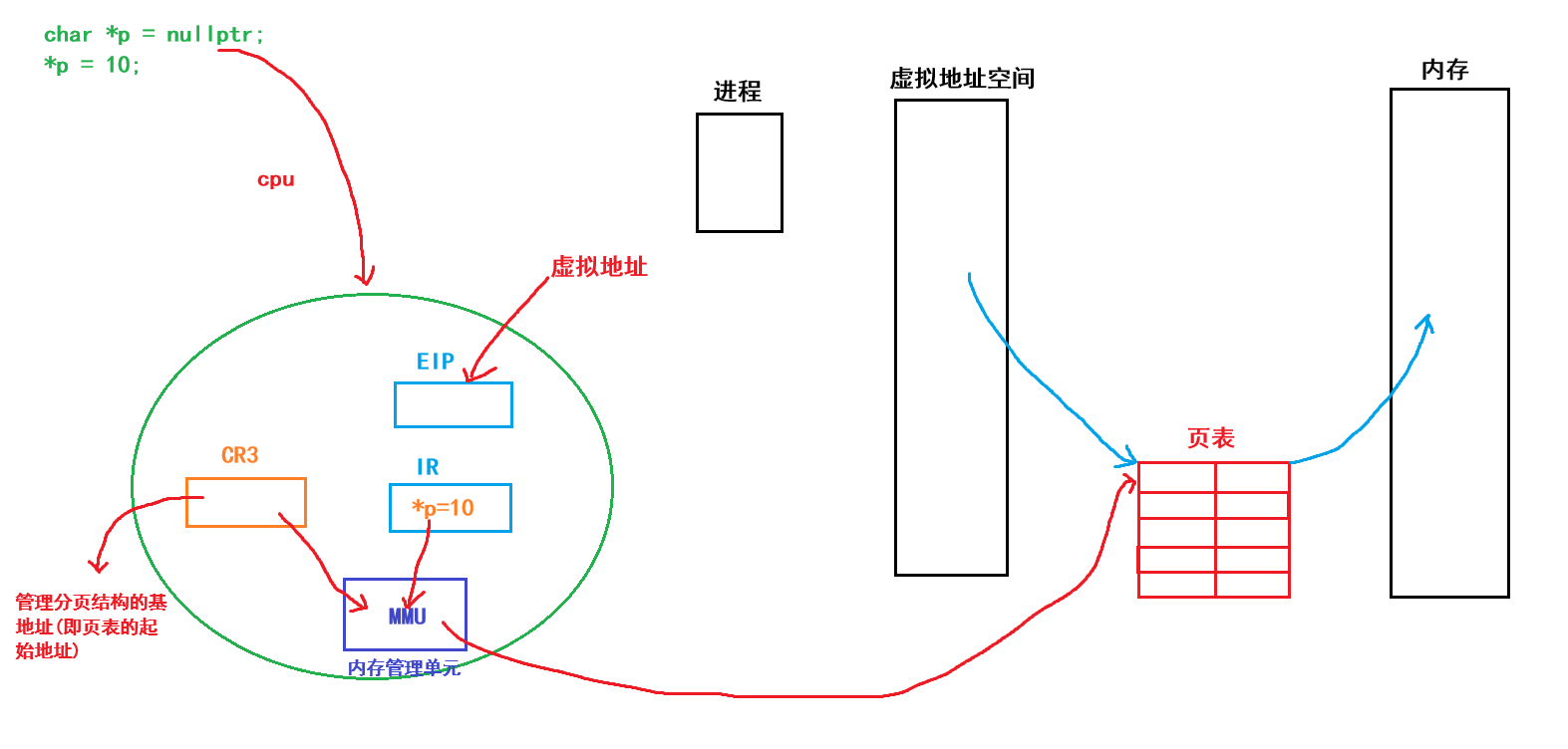 和上面一样对野指针解引用并进行赋值的操作同样是在cpu中进行的,在cpu中EIP寄存器存储的是要执行的下一条指令的虚拟地址,而IR寄存器存放的是要执行的指令,我们要想对野指针解引用,就要找到其物理地址,再将计算后的结果写入进去就行,这是正常流程。