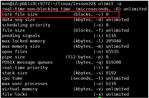 但是要完成这个工作有一个大前提:当前的系统允许生成core文件,什么意思呢?我们来看: