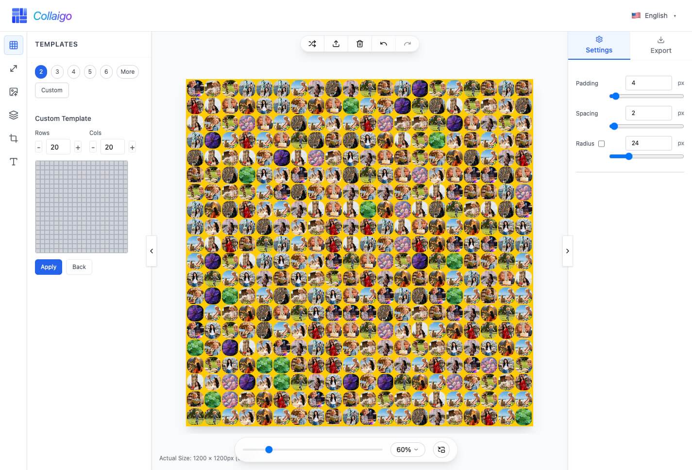 除了预设模板,我们还提供了完全自定义的网格布局功能。用户可以自由设置行列数、间距、边距,创造出独一无二的拼图效果。自定义布局最多支持400张照片。