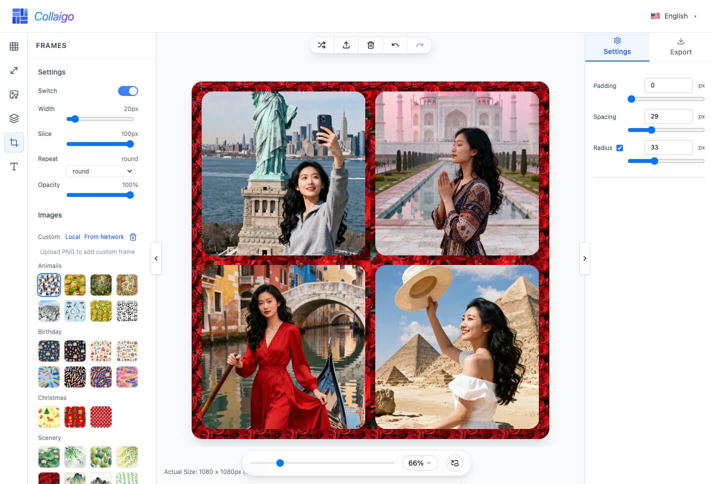 素材丰富:我们内置了多种主题的相框素材,包括生日、圣诞、动物、风景、星星等场景,满足不同创作需求。同时支持用户上传自定义相框。
