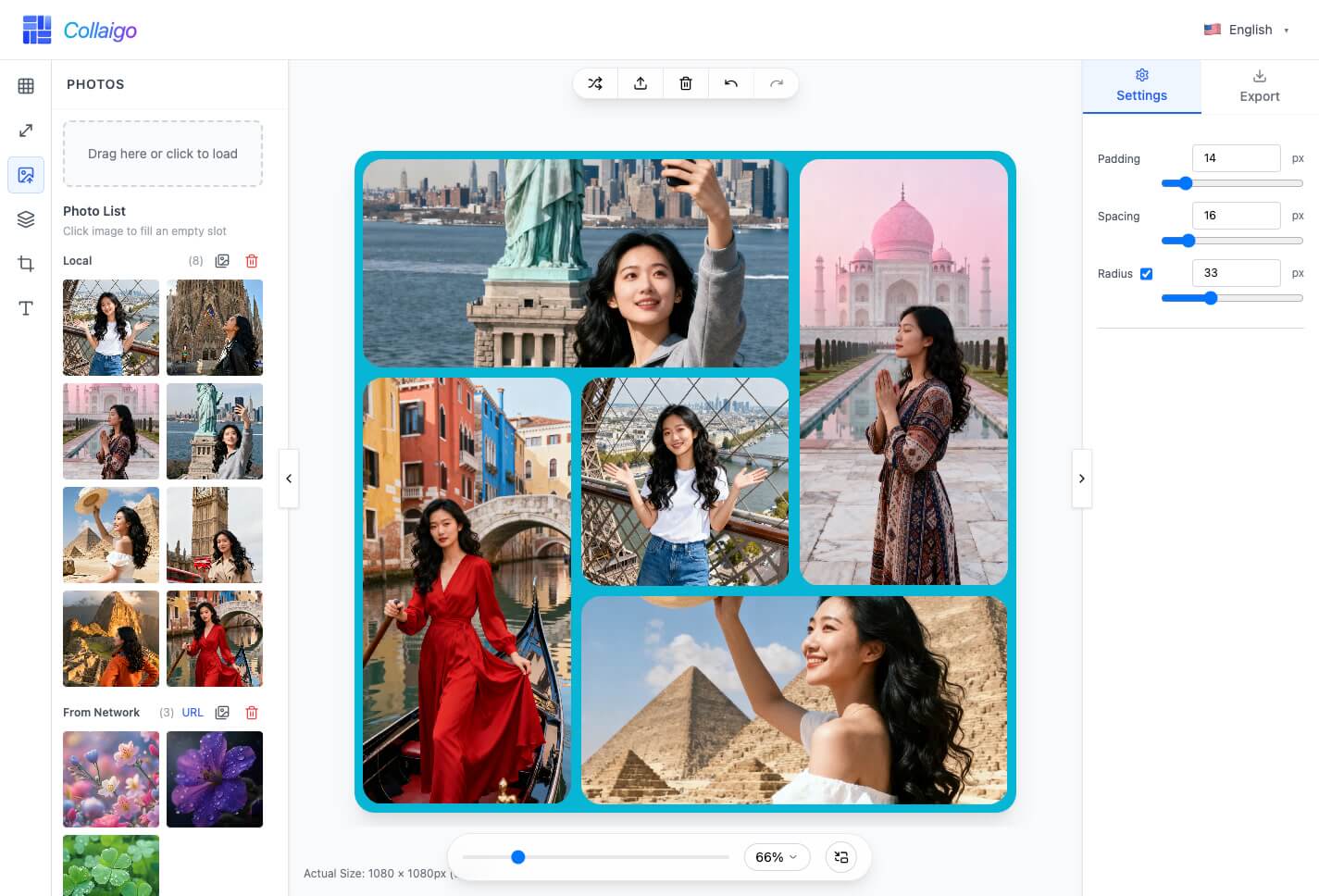 - 随机布局:一键随机调整图片位置,激发创作灵感
