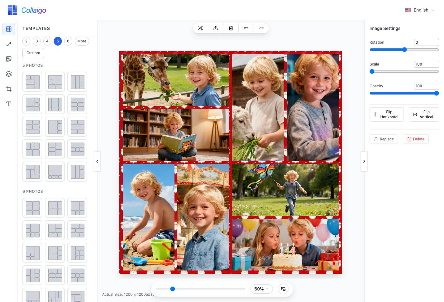 - 左侧面板:模板、布局、照片库、背景、相框、文本工具等