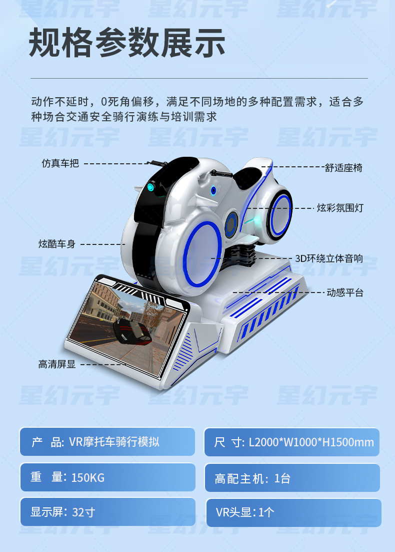 交互技术:多感官同步融合视、听、触觉体验,自主决策交互让骑行行为与后果直接挂钩,6DoF手柄实现精细化操作模拟。