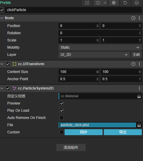 assets/resources/prefab/clickParticle - 确保预制体包含ParticleSystem2D组件