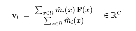给定一张像素特征图 F ∈ ℝ^{C×H×W} (来自 pixel decoder )和某个查询 i 产生的软掩码 \\hat m_i ∈ \[0,1\]\^{H×W} (来自 mask decoder 的 logits 经 sigmoid/softmax 后),对该实例做"掩码加权的特征汇聚":