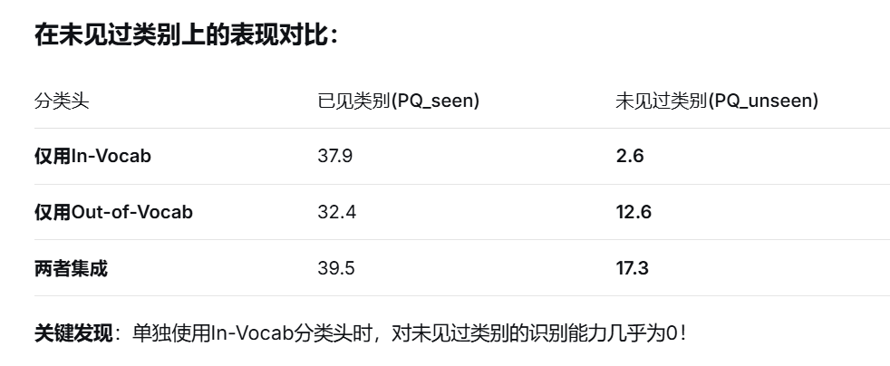 - In-vocab 分类头让模型能够微调特征空间,使其更适合分割任务,特别是对于训练集中见过的类别