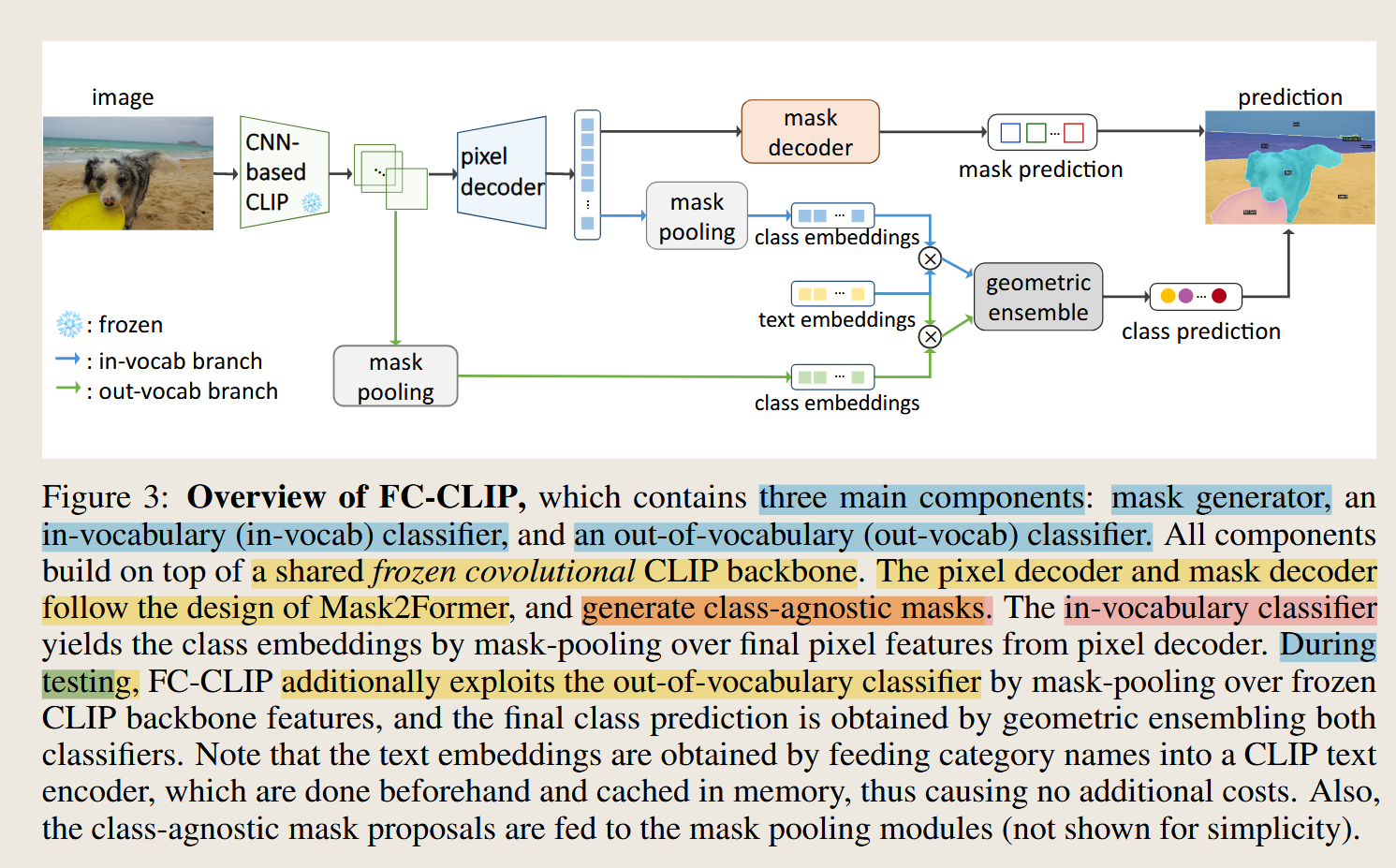 - 在一个共享的冻结卷积CLIP主干上构建掩码生成器和CLIP分类器,形成一个单阶段的框架FCCLIP。冻结的CLIP主干确保预训练的图像文本特征对齐完好,可以进行超出词汇范围的类别分类。