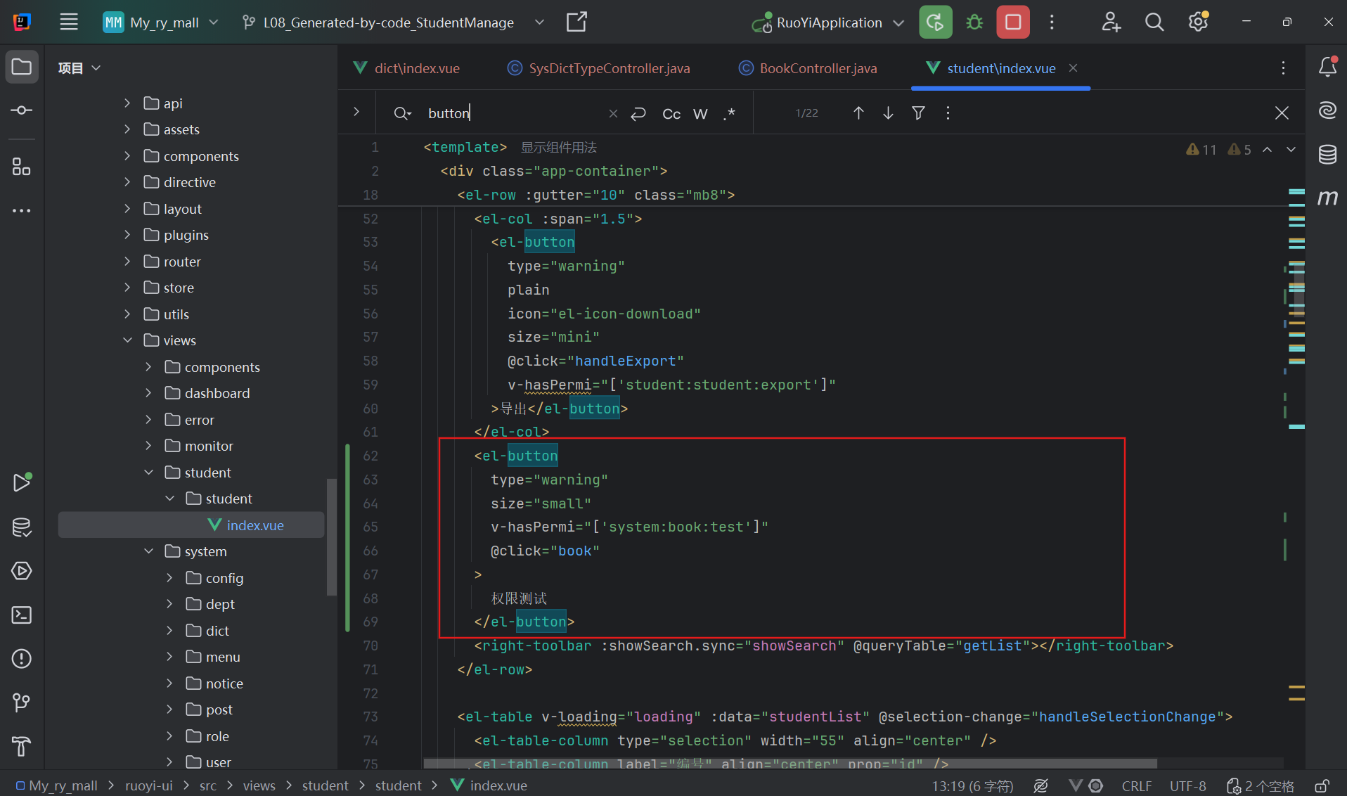 | 1️⃣ 后端 | 创建接口 + 加权限注解 | @PreAuthorize("@ss.hasPermi('system:test:permTest')") |
