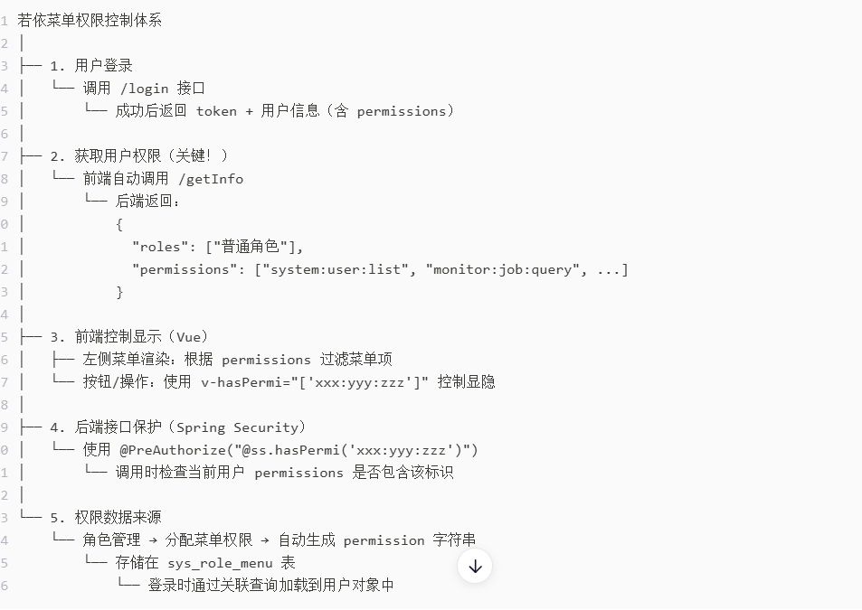 | 权限来源 | 从 sys_role_menu 表查出菜单 → 提取 perms 字段 |