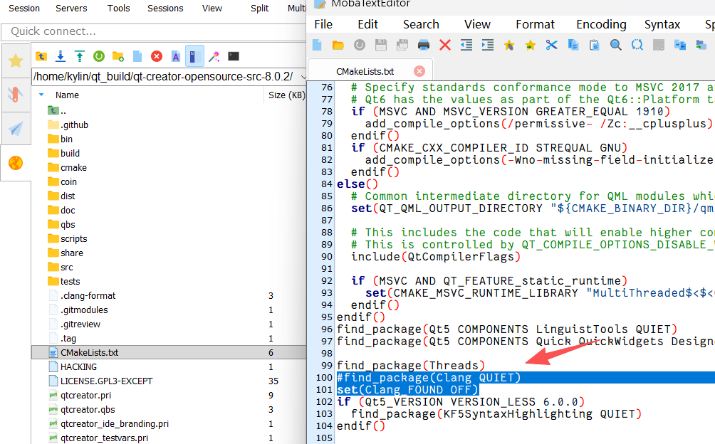1、打开qt-creator-opensource-src-8.0.2/CMakeLists.txt在100行位置注释并添加