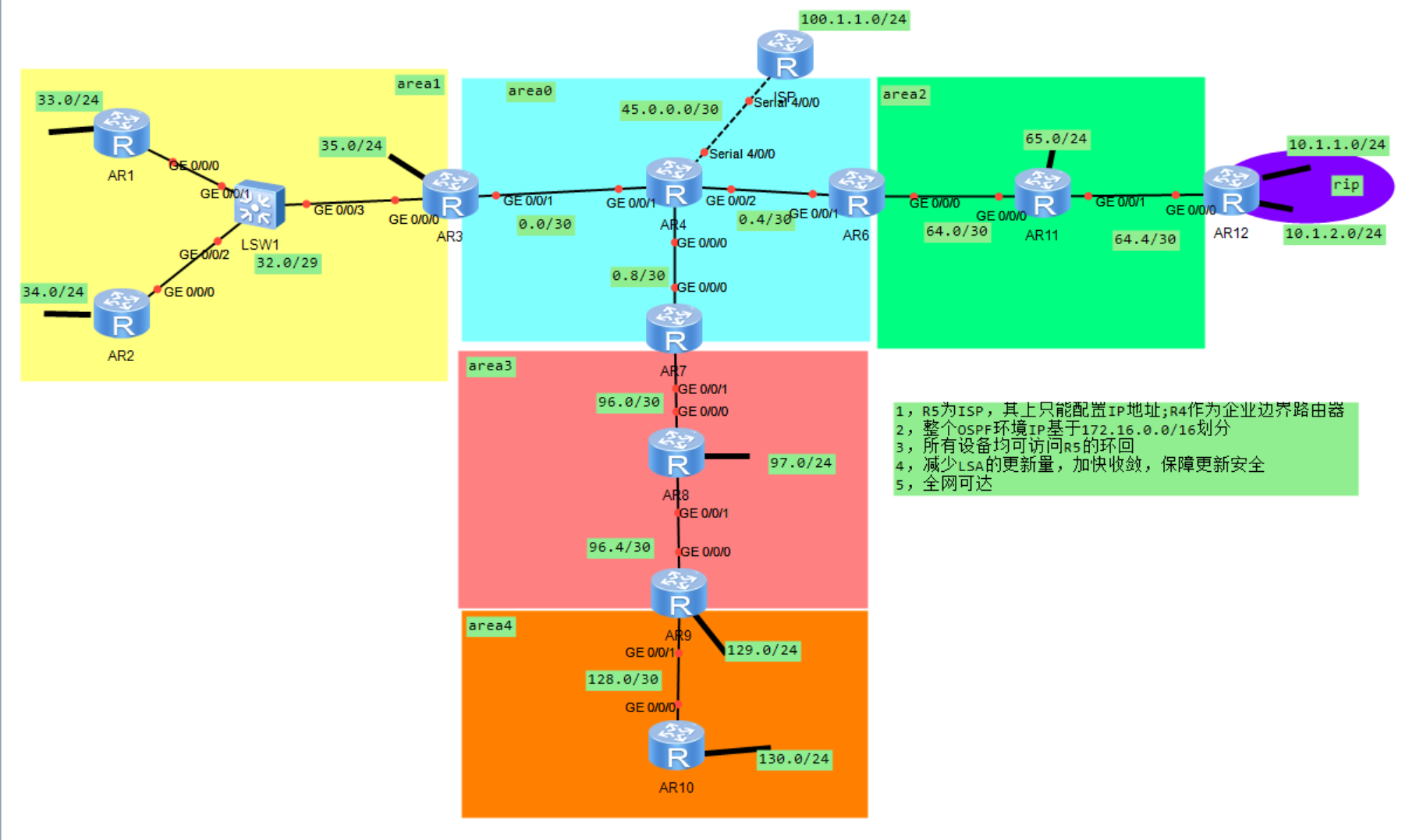 区域1可以做成完全末梢区域、区域2,区域3可以做成完全NSSA区域、区域4则不能做特殊区域(因为区域4上ospf 2的骨干区域 !骨干区域不能做成特殊区域!!!)
