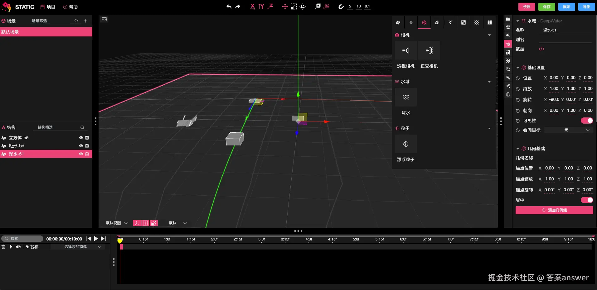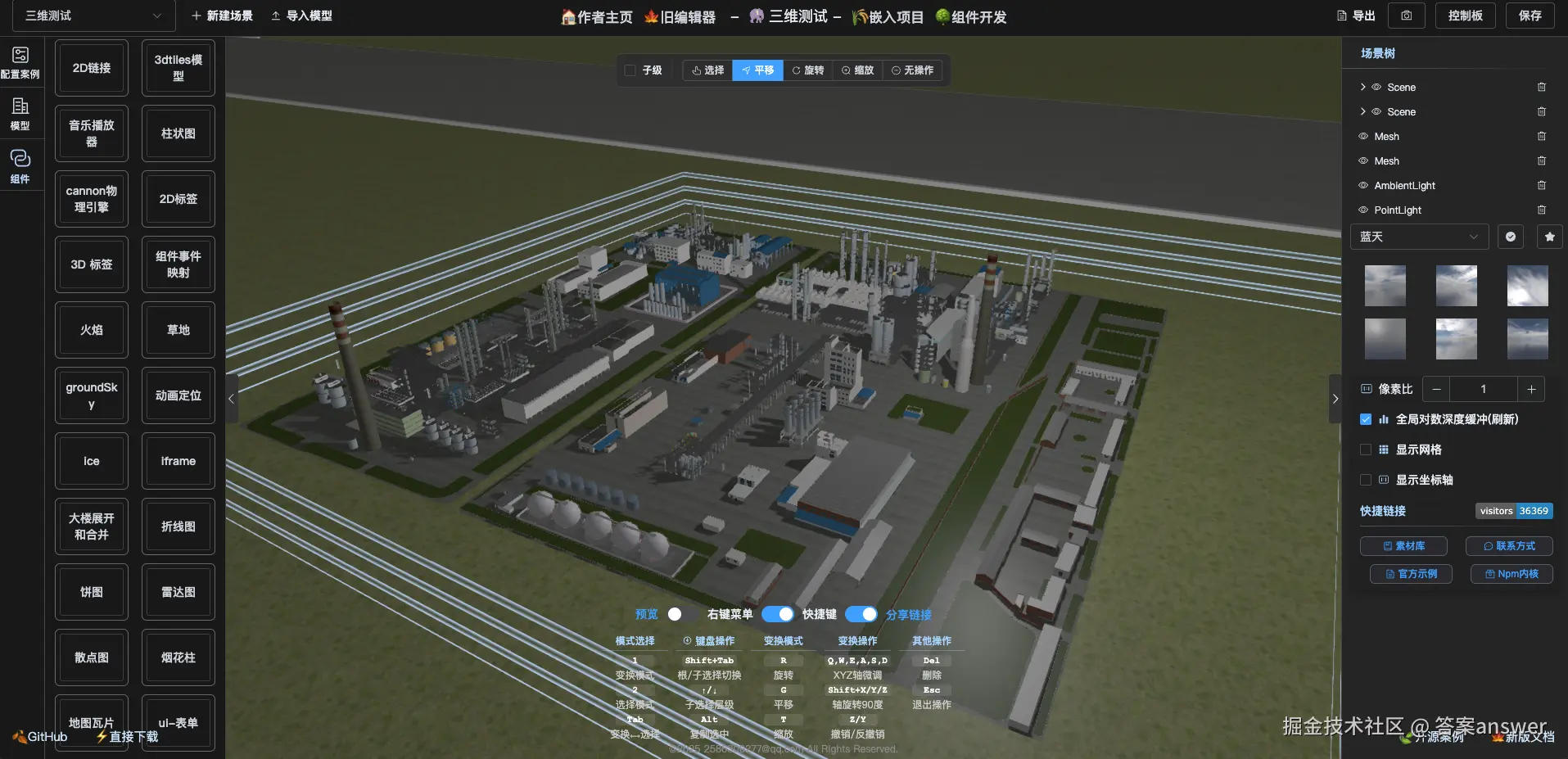 特点 :支持加载视频、文本、图片、粒子等内容并提供了丰富的编辑表单参数可视化编辑配置,同时还支持在线代码的脚本内容写入设置3D场景内容。
