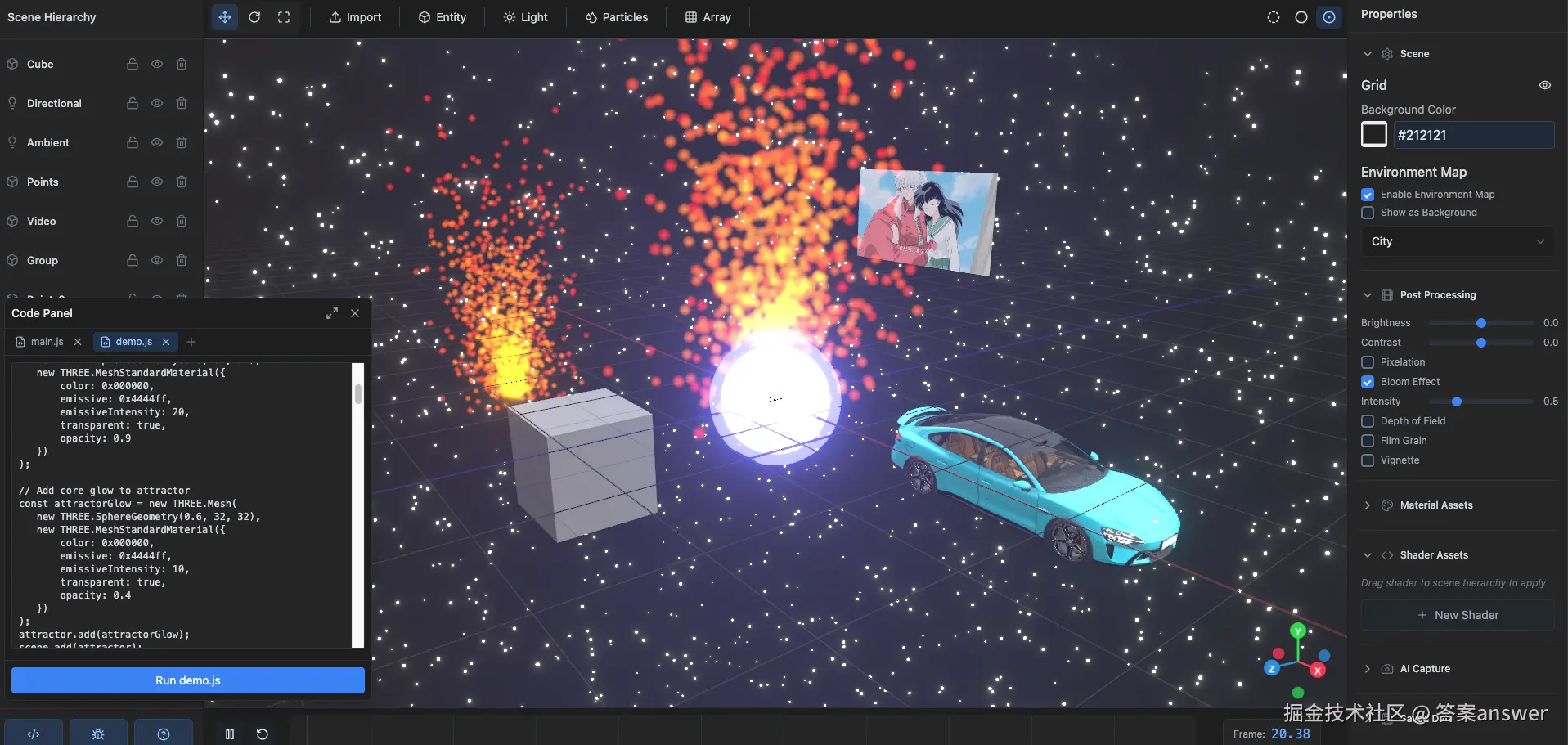 描述:一个「运行在浏览器里的 3D 编辑器 + 创意编码 (creative-coding) 环境」