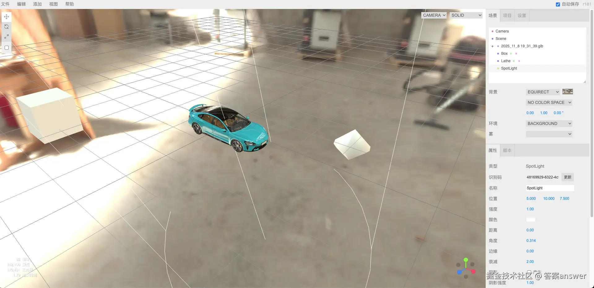 特点:基于vis-three 衍生开发的一个3D编辑器提供了一套较为完整的 Web 3D 场景编辑功能 --- 目标是让你即使对 3D 或 Three.js 不熟,也能比较轻松地 "拖/配/编辑" 出一个 3D 场景
