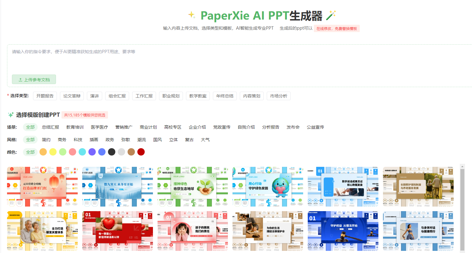 - 视觉风格多维参数化:支持按"场景(高校专区/教育培训/商务计划)+ 风格(简约/科技/国风)+ 颜色(RGB/HEX自定义)"三级参数进行模板筛选,共提供15185套结构化模板,确保视觉表达与学科主题或企业品牌高度契合。