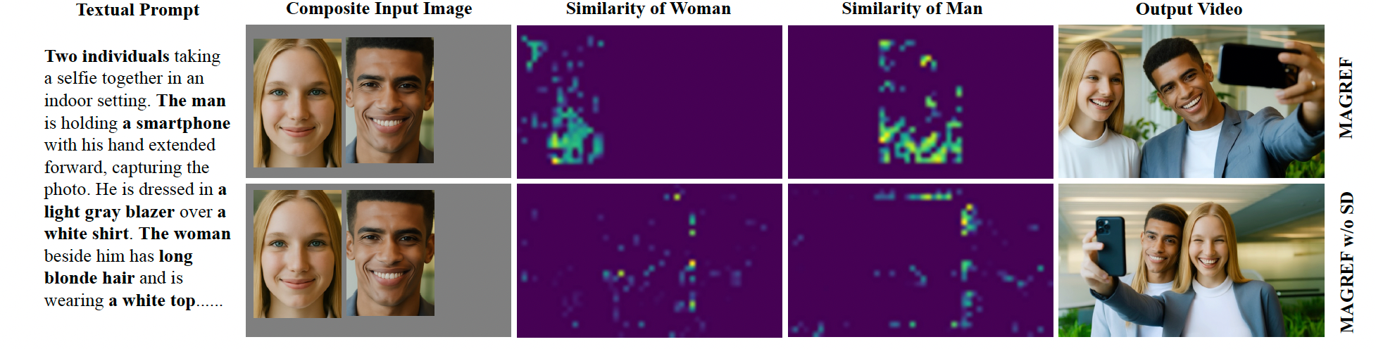 图 4:复合参考输入图像与文本标签之间的余弦相似度可视化。MAGREF 在多主体复合图像中能够更准确地将"男人(Man)"和"女人(Woman)"与对应的文本提示对齐。相比之下,移除主体解耦(SD)后,会导致主体之间的关联变得纠缠且模糊不清。
