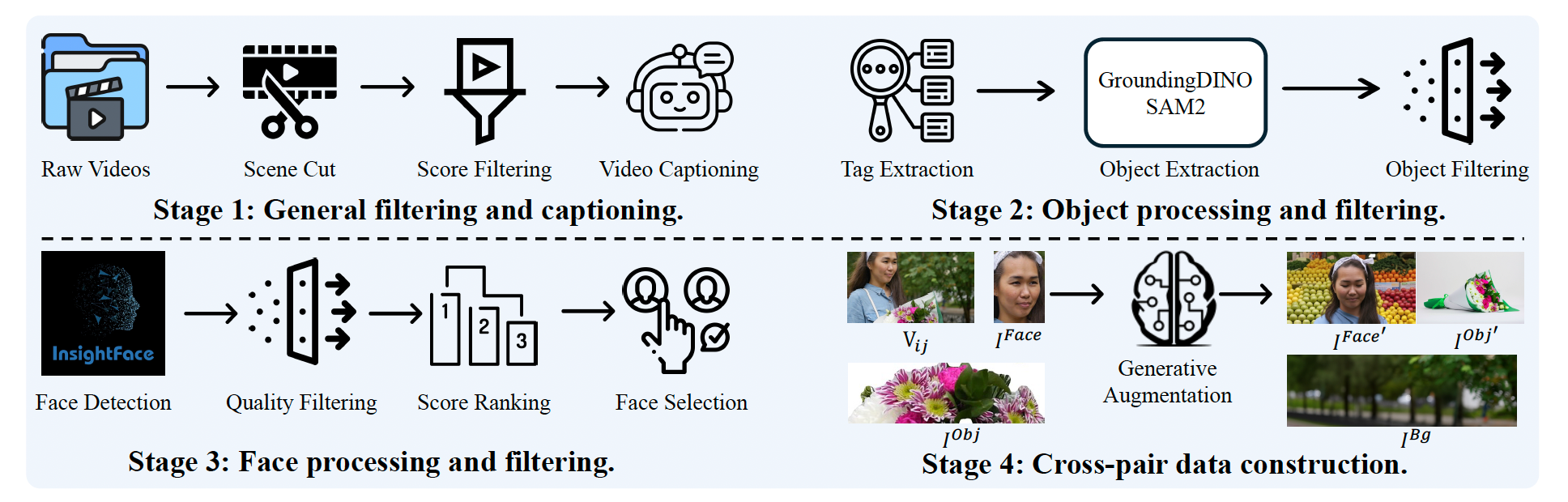 其中, V i V_i Vi 表示视频片段, C i C_i Ci 是文本描述, ( I i Face , I i Face ′ ) (I_i^{\text{Face}}, I_i^{\text{Face}'}) (IiFace,IiFace′) 分别为原始与变换后的人脸参考对, ( I i , j Obj , I i , j Obj ′ ) (I_{i,j}^{\text{Obj}}, I_{i,j}^{\text{Obj}'}) (Ii,jObj,Ii,jObj′) 表示物体的变体参考对, I i Bg I_i^{\text{Bg}} IiBg 表示背景参考。关于该管线的更多细节见附录 B。