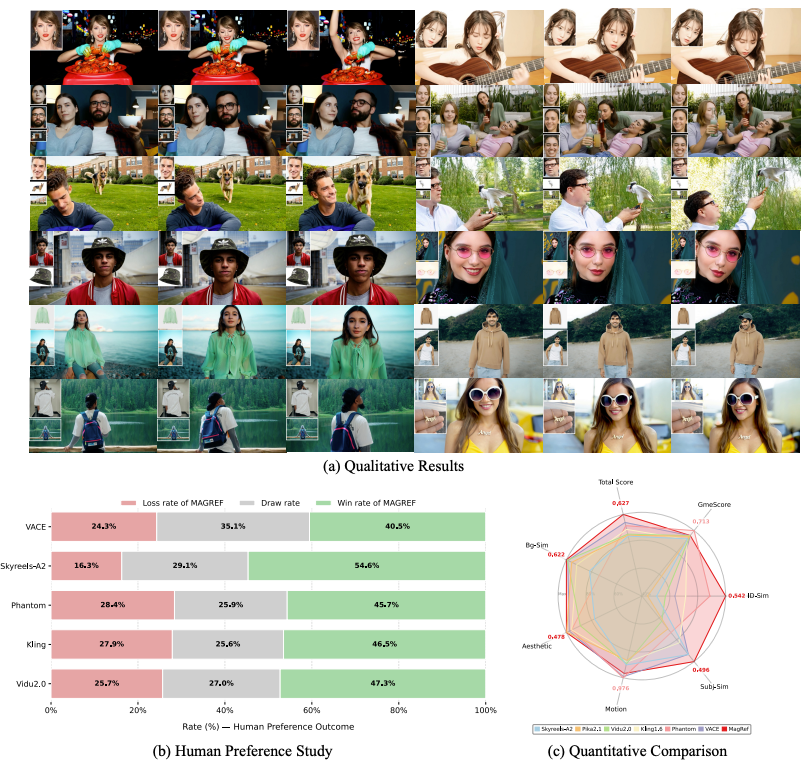 图 1 我们提出了 MAGREF,一个灵活的视频生成框架,能够在一次生成过程中支持包括人类、动物、服饰、配饰和环境在内的任意主体组合,同时保持视觉一致性并忠实遵循文本指令。(a) 在多样主体与场景上的定性结果,左上角给出了参考图像。更多定性案例见图 9--13。(b) 将 MAGREF 与现有模型进行比较的用户研究结果。© 在多主体评估集上的定量对比结果。