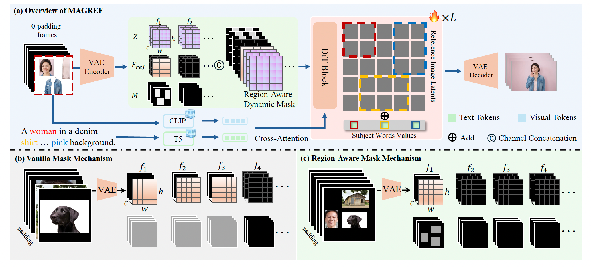 图 3 (a) MAGREF 概览。我们引入了一种区域感知的掩码机制来编码多个参考图像,并将其与噪声潜变量进行拼接;同时通过主体解耦,将每个参考主体与其对应的文本标签建立关联,以避免跨主体纠缠。与 (b) 朴素掩码机制(将参考图像在帧维度上拼接)相比,我们的 © 区域感知掩码机制将多个参考合成为一张复合图像,经由 VAE 编码后,再应用下采样的二值掩码以标注主体区域,从而在图生视频(I2V)模型中更好地保持首帧一致性。
