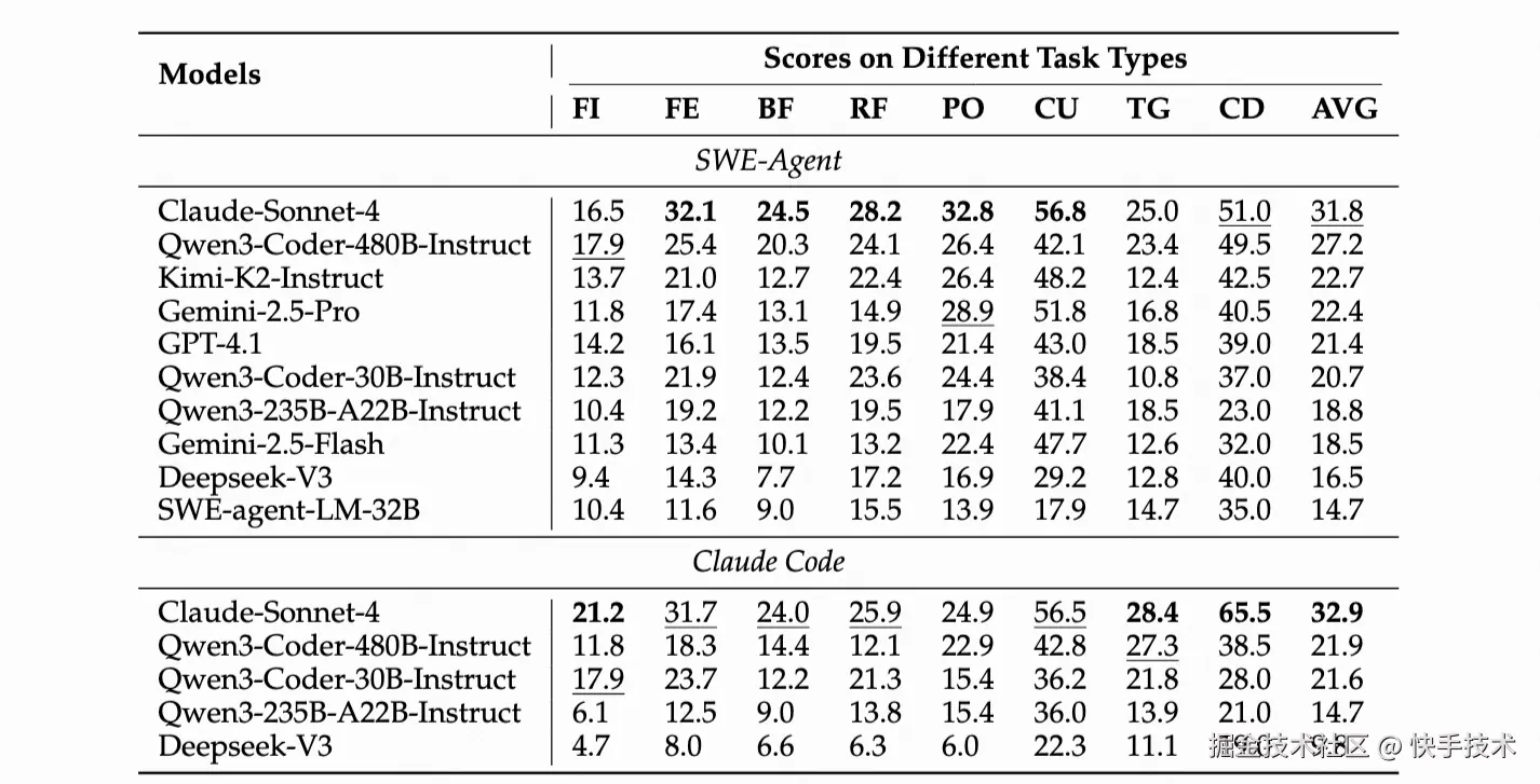 研究团队在 SWE-Agent 和 Claude Code 两种主流智能体框架下,对 10 款前沿模型进行严格测试,包括 Claude-Sonnet-4、Qwen3-Coder 系列、GPT-4.1、Gemini-2.5 等明星模型。