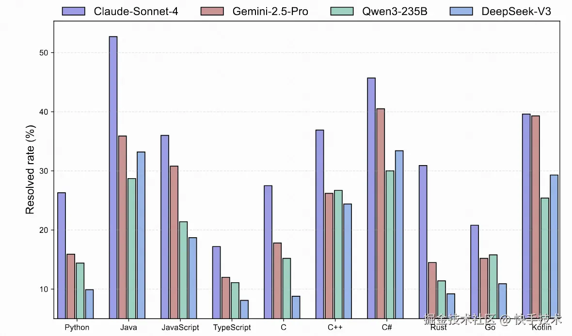 核心发现 3:语言生态差异显著如下图所示,模型在 JVM 生态和 JavaScript 上表现最佳,而系统级语言( C / C++ / Rust / Go)成为普遍难点。这种分层反映了不同语言生态的工具链成熟度和诊断便利性对模型性能的深刻影响。
