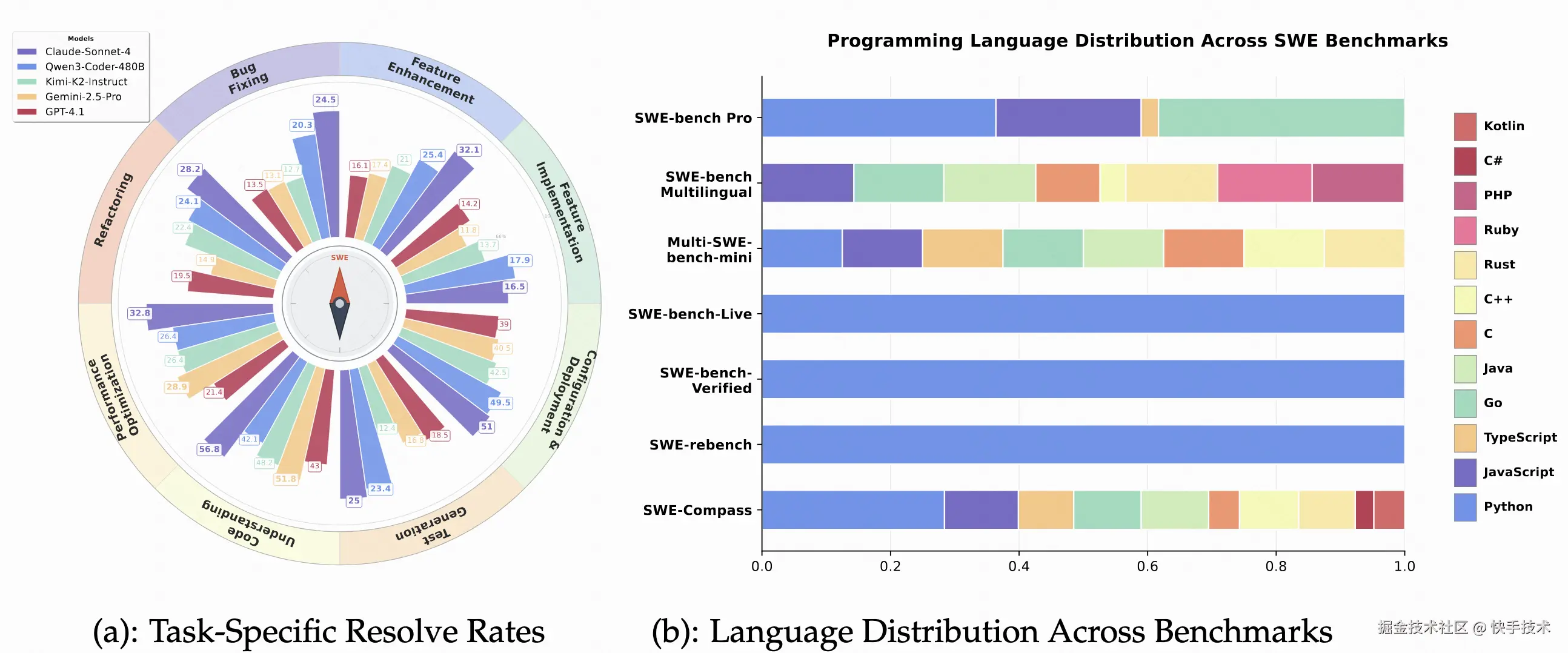 在激烈的"最强代码模型"争论中,我们急需一个能够真实反映工业级软件开发复杂度的评估基准。近日,快手 KwaiKAT 团队与南京大学刘佳恒老师 NJU-LINK 合作推出 SWE-Compass ------一个涵盖 8 大任务类型、8 大编程场景、10 种编程语言的代码智能统一评估框架,它包含 2000 个高质量实例,在任务类别、编程场景和语言方面实现了良好的平衡,为评估大型语言模型在实际软件工程任务中的能力提供了一个严格且具有代表性的评估框架。