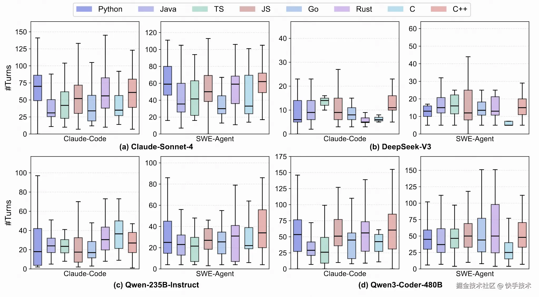 图 7: 不同模型对于 SWE-Compass 上不同语言任务的交互轮数