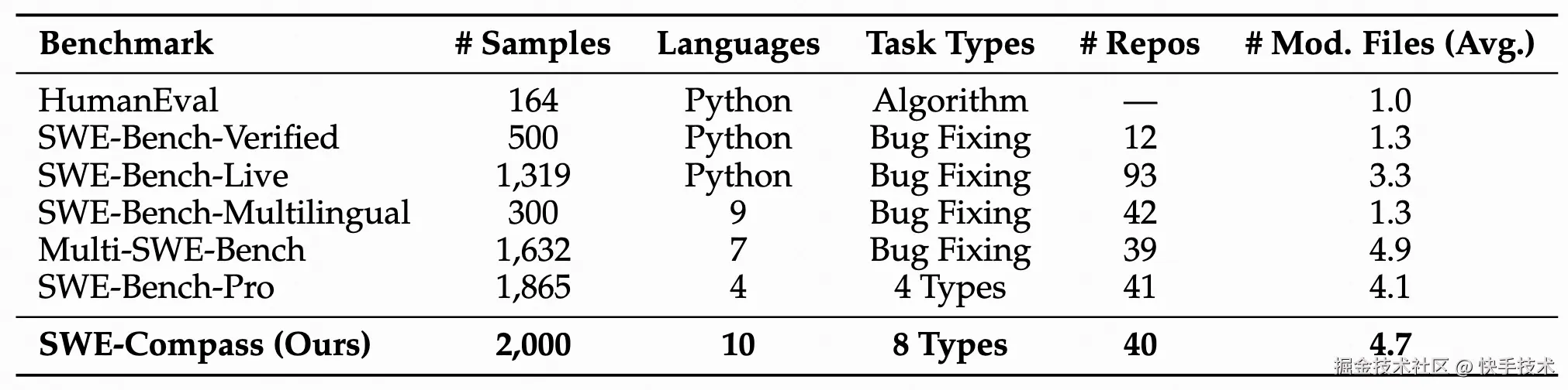 表 1:SWE-Compass 与现有基准测试在不同维度上的综合比较