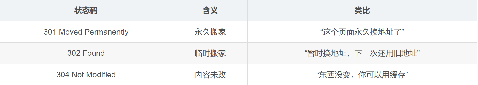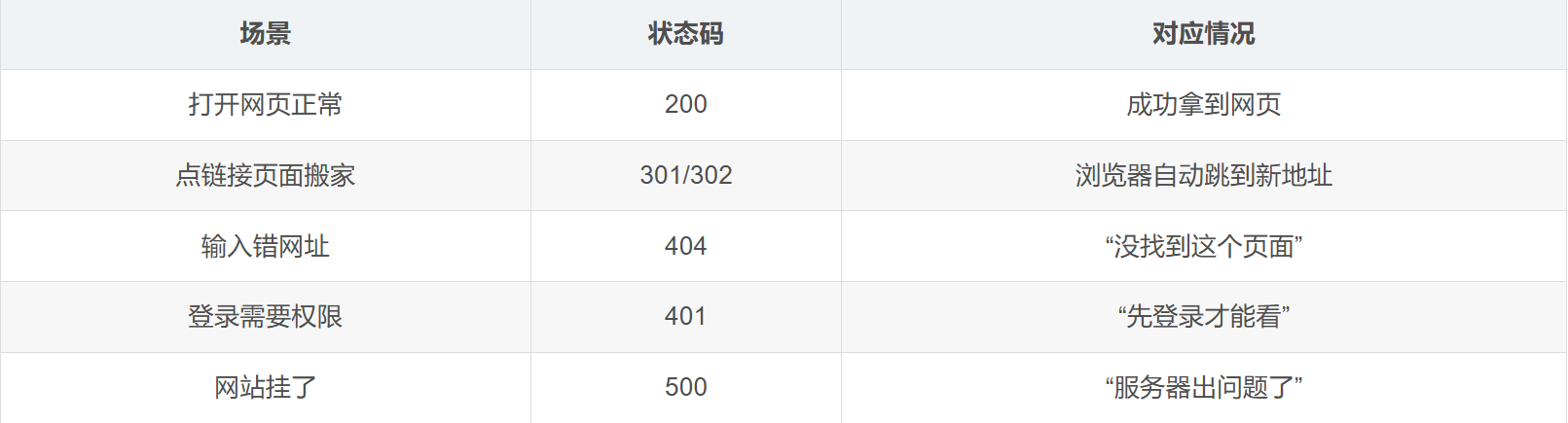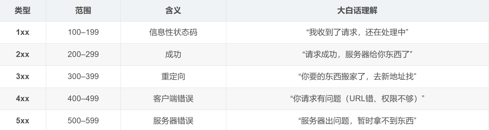 HTTP 状态码就是服务器对你请求的"回话信息",告诉你请求成功没、东西搬没搬、你有没有权限、或者服务器出问题了。