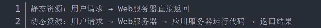 - 服务器处理:Web 服务器处理静态资源请求动态请求
