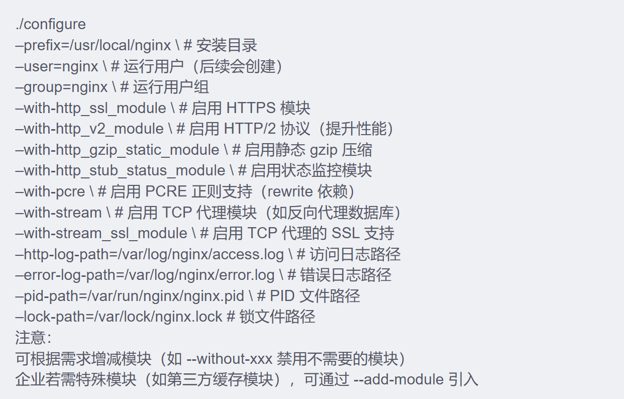 在 Nginx 实战部分,我们从环境准备、依赖安装、用户创建,到编译配置、服务启停与系统服务注册,完整呈现了 Nginx 1.20 版本的安装流程,同时补充了 Nginx 的进程结构、核心功能(静态资源服务、反向代理等)及与 Apache 的差异,让读者不仅能完成安装操作,更能理解背后的设计逻辑。