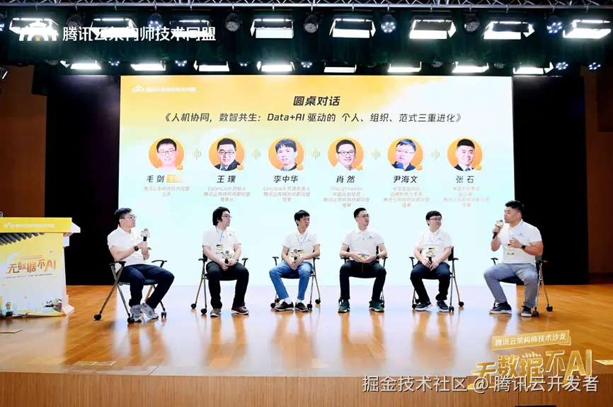 活动最后,来到精彩的圆桌对话环节。在腾讯云架构师技术同盟主席 毛剑 的主持下,围绕 "人机协同,数智共生:Data+AI 驱动的个人、组织、范式三重进化" 主题,DatenLord 创始人、腾讯云架构师成都同盟理事长 王璞,Easystack 开源负责人、腾讯云架构师成都同盟理事 李中华,Thoughtworks 中国区总经理、腾讯云架构师成都同盟理事 肖然,中亦安图科技品牌影响力专家、腾讯云架构师成都同盟理事 尹海文,禅道软件集团副总裁、腾讯云架构师成都同盟理事 张石,多角度探讨 AI 时代下开发者能力、组织形态、技术范式的协同进化,真诚分享自身经历与深刻思考,为与会者带来启发。
