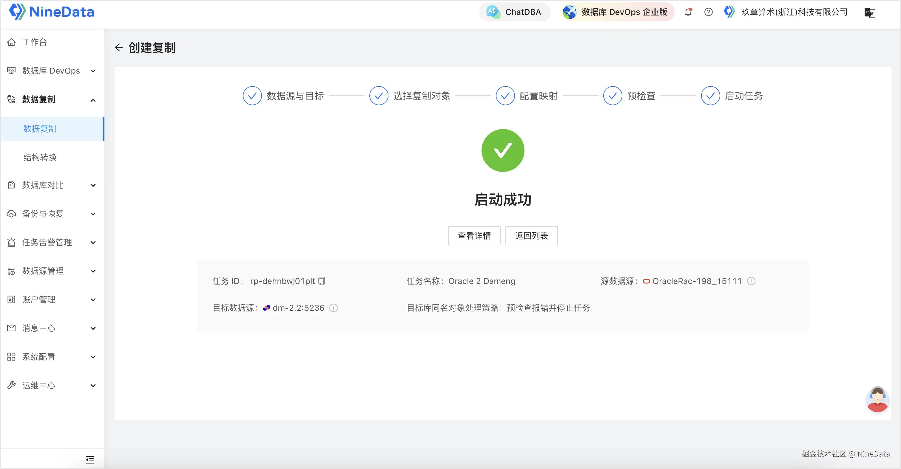 至此,配置工作已经全部完成! 剩下的就交给 NineData 会自动完成,然后在业务低峰期手动切换业务即可。