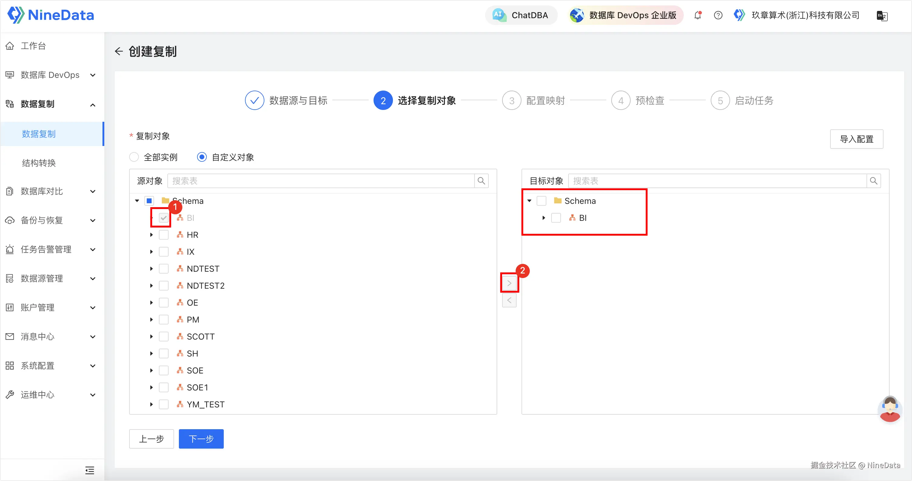- 选择需要复制的数据库对象(Schema/库/表/列)。