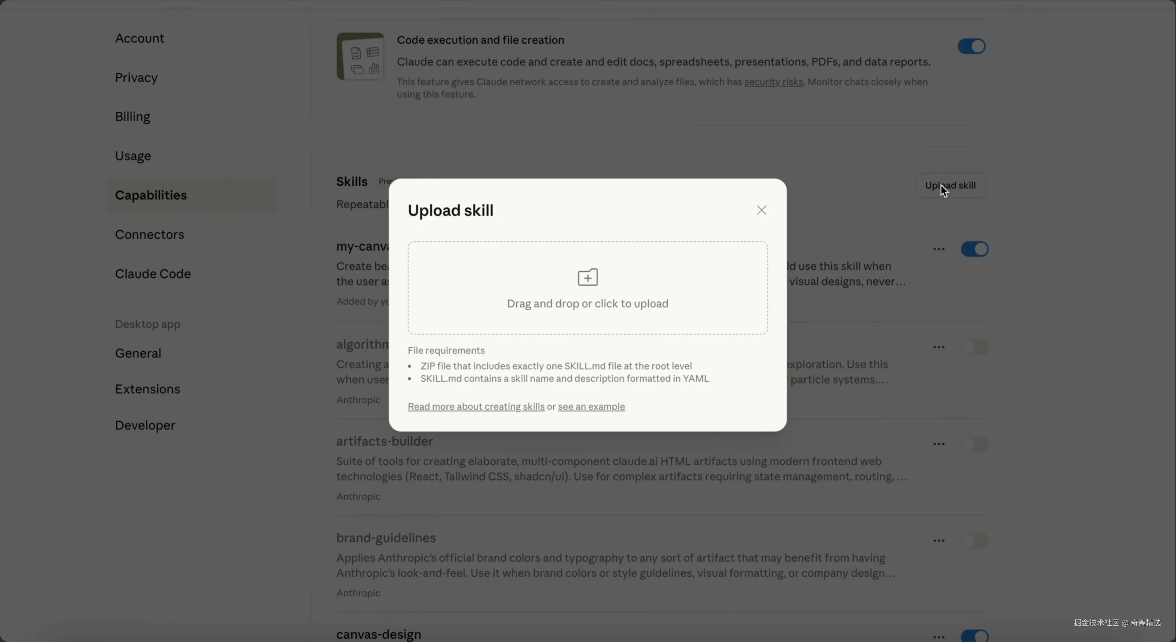 Anthropic 在 Claude 上提供了一些预制的技能可以开启,也支持用户自己上传 zip 包来使用: