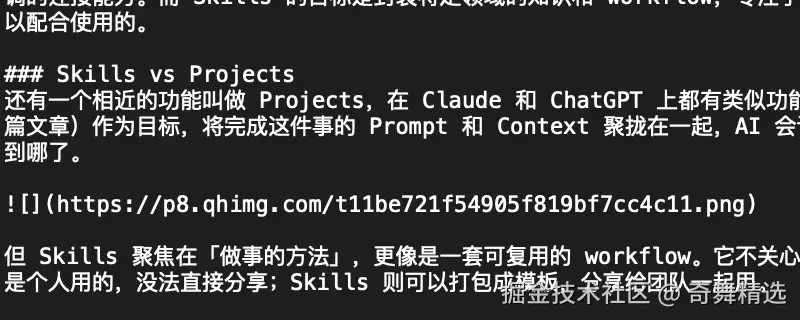 但 Skills 聚焦在「做事的方法」,更像是一套可复用的 workflow。它不关心你在做哪个项目,而是帮你保持统一的做事风格或标准。而且 Projects 通常是个人用的,没法直接分享;Skills 则可以打包成模板,分享给团队一起用。