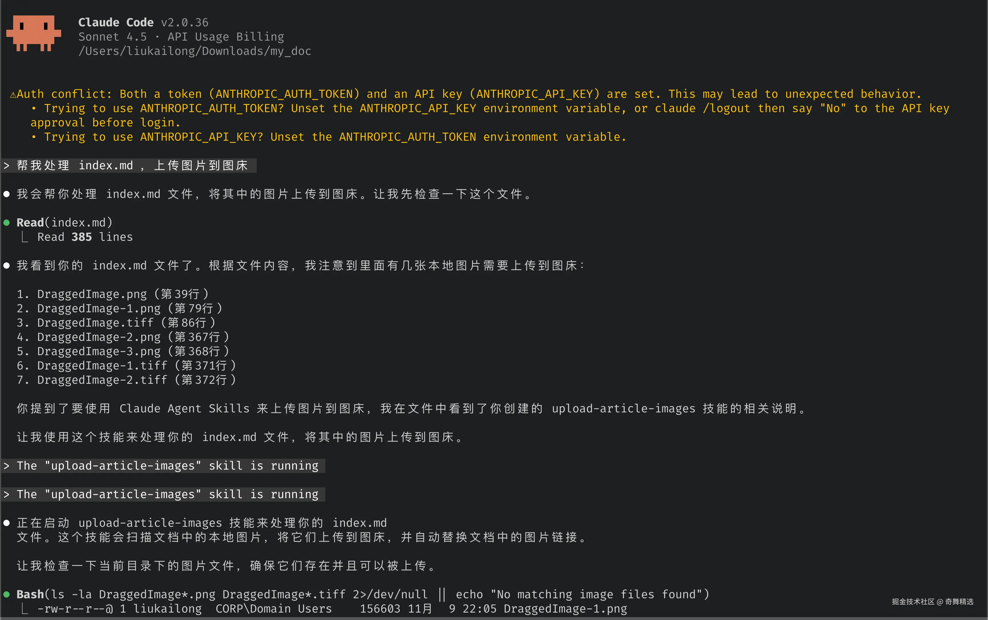 接下来我们创建一个实用的 Skill:上传图床助手 :平时在写完技术文章之后,发布的过程其实挺麻烦的,因为我经常使用 Ulysses 写作,导出为 Markdown 后,很多图片引用实际是在本地的,如果要发布一般还是要上传到图床上才能直接用。另外,我引用的一些图片的格式很多地方不支持,需要统一成 png 来上传。