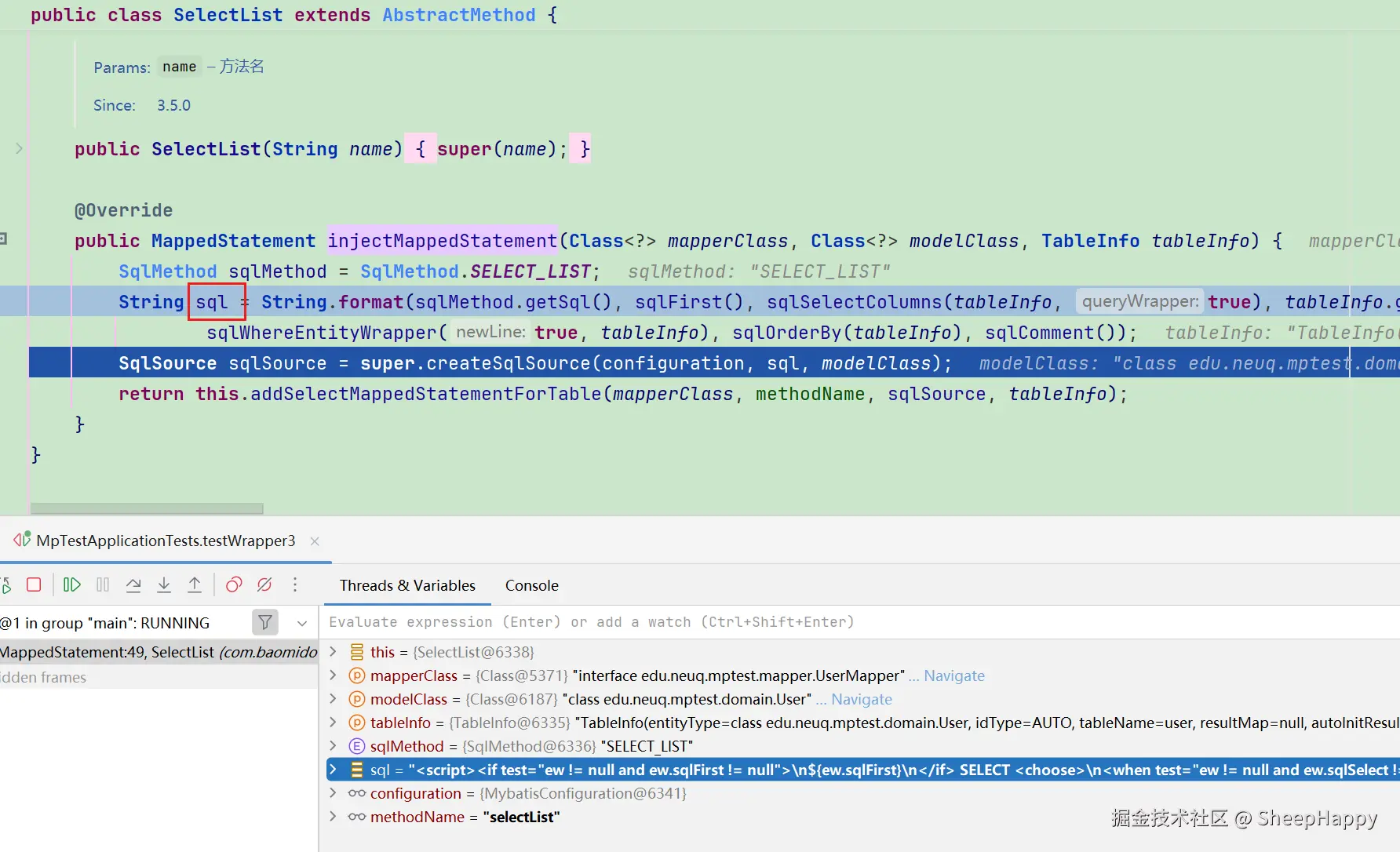 在 SelectList#injectMappedStatement 方法中,我们能看到核心 SQL 配置。