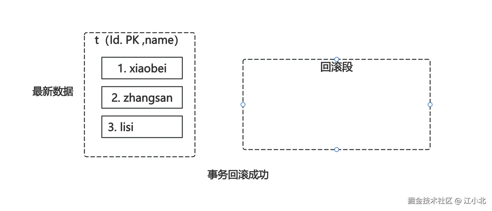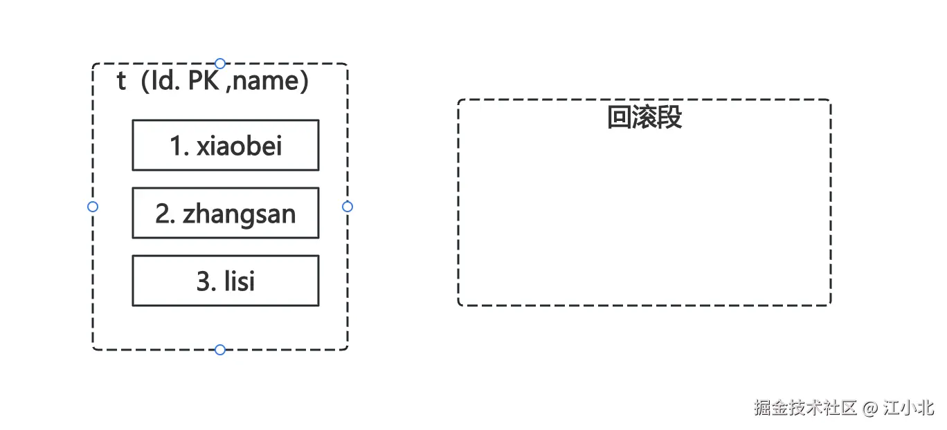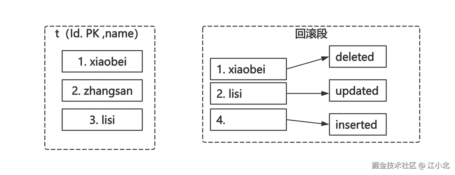 存储undo日志的地方叫回滚段。我们用一个例子来看它如何工作。